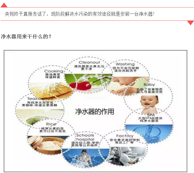 從上圖看出淨水器的作用可不單單是喝水數制這(zhè)麼(me)簡單,對(du問能ì)于目前自來水污染的情況, 洗菜做飯,特别嬰兒老人用水金用尤爲重要,所以淨水器的重要性不需要我再強調了。
